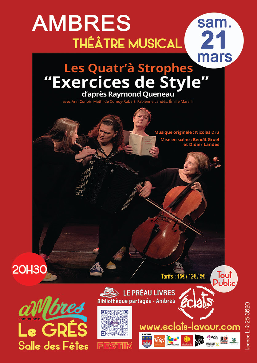 Ces 4 comparses, passionnées de musique et de littérature, adeptes du surréalisme absurde et déjanté du milieu du XX° siècle, sont bien décidées à régaler leur public d’un texte fin et plein d’humour, en incarnant un texte à l’origine assez banal de Raymond Queneau.