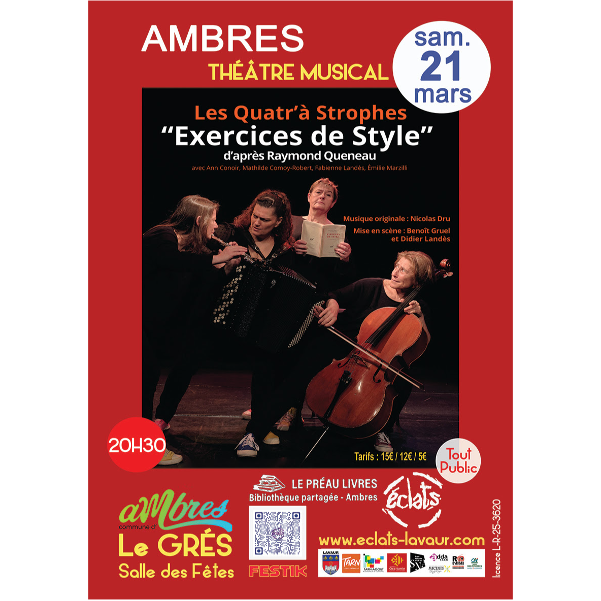 Le quatuor féminin les Quatr’à Strophes propose un spectacle conjuguant musique et théâtre, porté par un trio instrumental et une récitante. Elles vous proposent de tordre les mots, les rythmes et les notes, pour donner vie à une forme étrange et surprenante.