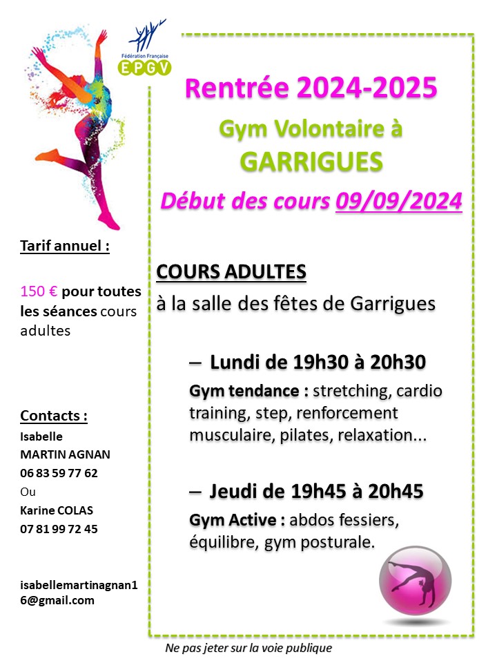 Tonique, dynamique, chaleureuse, variée, la Gymnastique Volontaire de Garrigues, affiliée à la FFEPGV (Fédération Française d’Education Physique et gymnastique Volontaire) vous accueille depuis 1992.